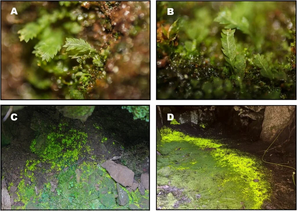 Figura extraída del artículo de Robla et al. 2023 en Journal of Bryology. Se puede ver la forma característica de los filidios (hojas) de Schistostega pennata (A-B) y el fulgor verde esmeralda (C-D) que tiene el protonema en la entrada de las cuevas donde crece. A-C: Omar Sánchez y D: Julio Eiroa.