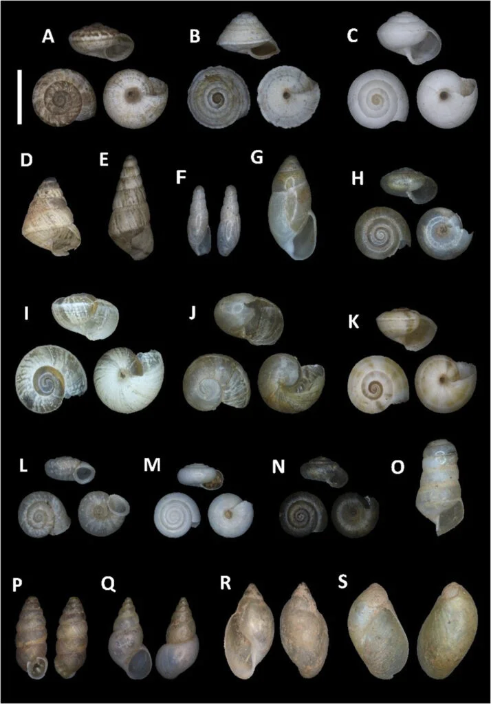 Todas las especies de caracoles encontradas en los hormigueros analizados en Robla et al. (2025).